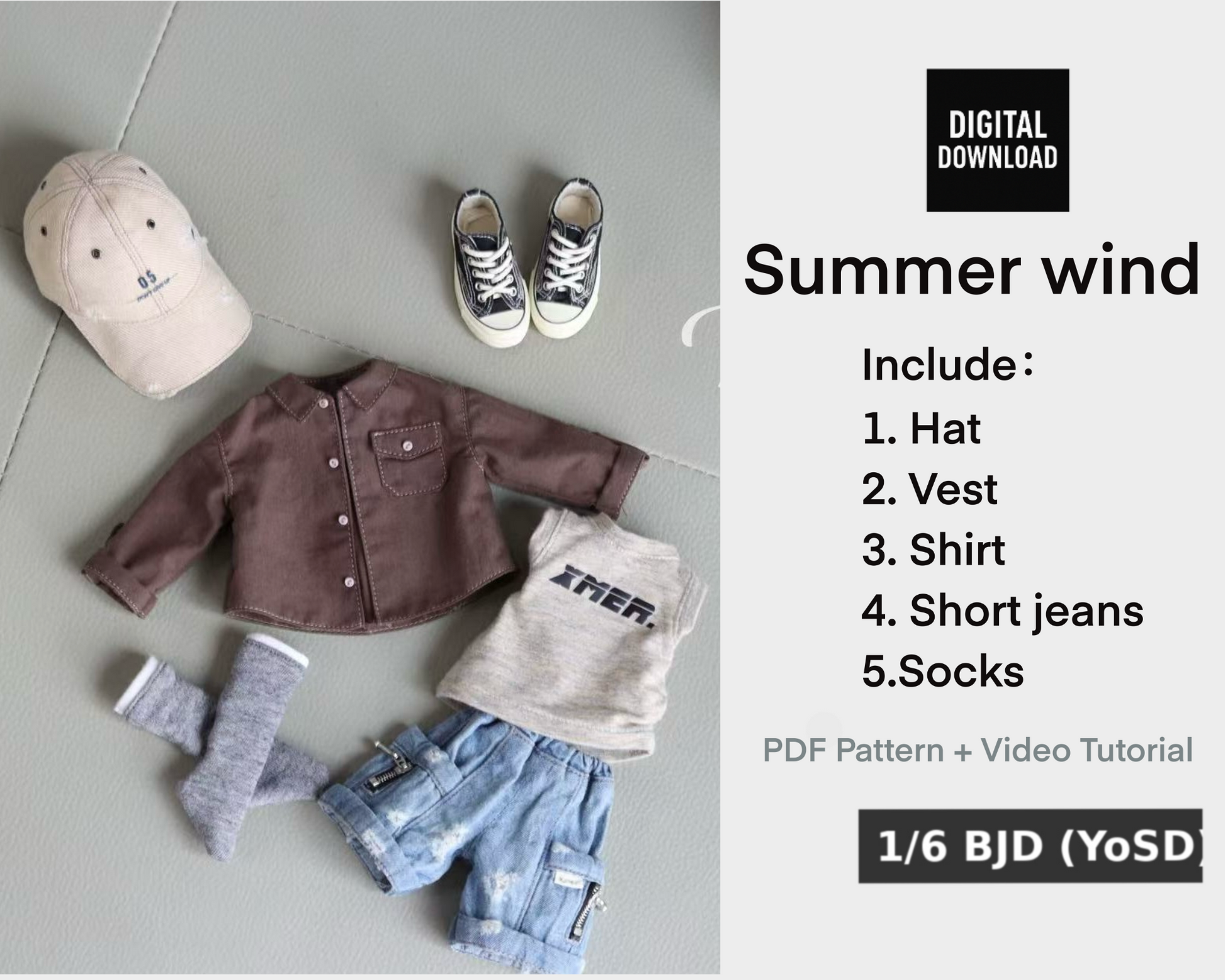 Incluye un patrón BJD a escala 1/6 y un videotutorial. Presta atención a las medidas de la modelo, ya que la cintura de este patrón podría no ser adecuada para MSD. Sobre todo si tienes una Minifee, le quedará grande. Compara la talla de tu muñeca para decidir si la compras. Encuentra el mismo patrón, pero en diferentes tallas, como 1/3 y 1/4, en otro enlace.